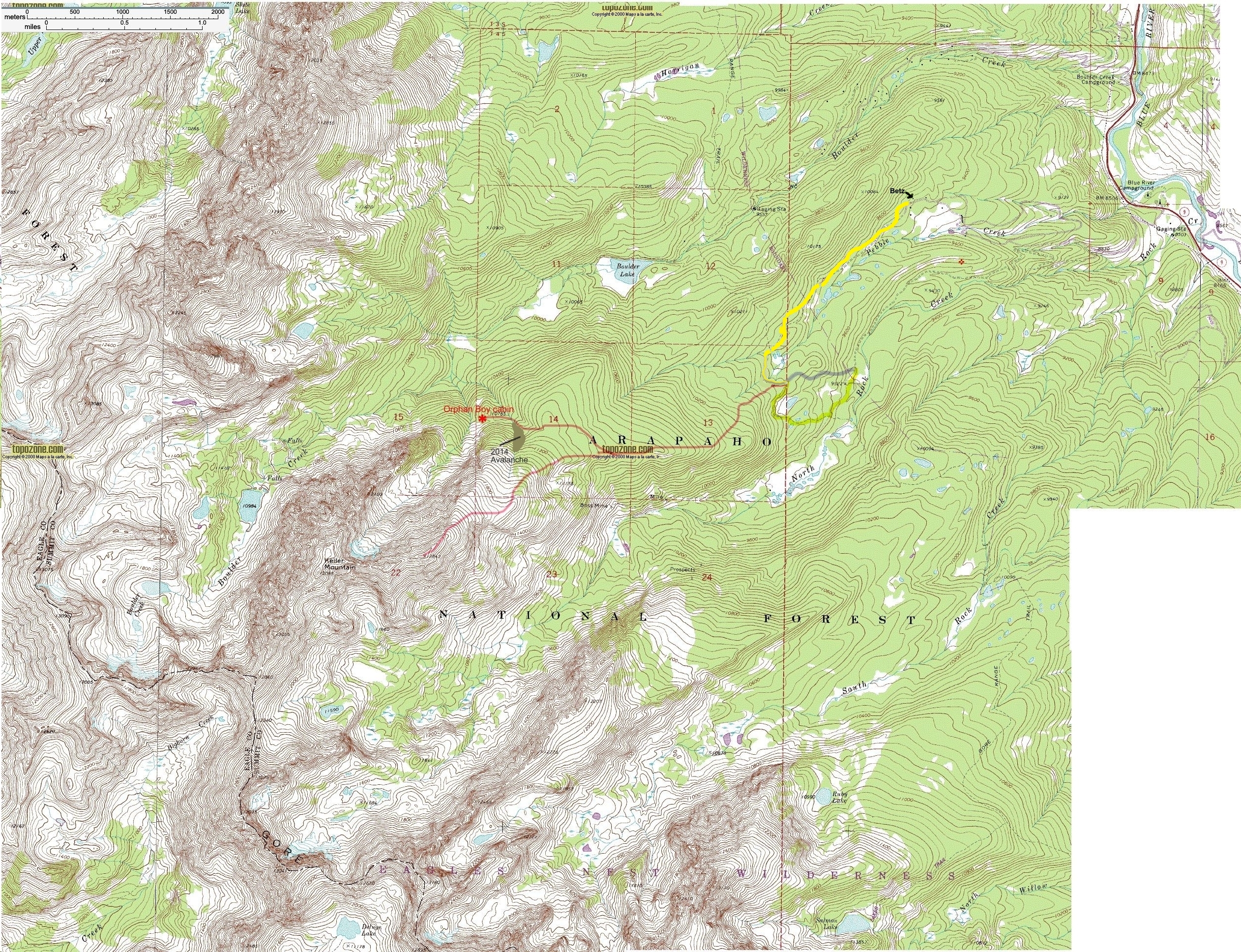 Three beginning routes are marked on the map below - from top to bottom: Pebble Creek trail (private ranch - you'll need permission to park), Old Wagon Road (leaves directly out the back of the parking lot on Rock Creek - now badly blocked by deadfall), and Rock Creek route (from Rock Creek parking lot to Gore Range Trail, then north). There is a 4th trail that leaves from the top of the Boss Mine dump and goes up to the ridge. The route up the mountain follows the Old Wagon Road above the GRT. The intersection of the road and GRT is at the north side of the large wetland just downslope from the GRT, near the intersection of the conifer forest on the north and an aspen hillside on the south. Head up the Old Wagon Road above the GRT - it starts with a hard, steep pull and continues up, up, up. In 2021, there were hundreds of trees down across the trail, but it is not difficult to stay on route. Once on the ridge, you can begin to see up North Rock Creek Valley (~10,600'), ending with a nice rest spot (and downed log) with a view of the North Rock Creek headwall and summit of Mt.Keller (12,800'). Continuing on, you will pass a man-made ditch on your left that heads straight down the fall line. You are now directly above the Boss Mine tailings (the ditch was used to snake logs down to the mine, and it was a favored route by the Coopers). Continue on a short distance to the fork in the trail (in 2017, a tree fell right at the fork). The left fork goes up to timberline, the right fork goes to the Orphan Boy cabin. This trail gently climbs about 200', curving around to the left, and ends at the remains of a log cache (about 4' high). You are now on the edge of the ravine, and will descend steeply nearly 400' through a stunning virgin spruce forest, crossing a small stream and an avalanche track - a big slide occured in ~2014, and it is easiest to work your way down along side of it until you can cross over. Then go up the hill a short distance and you will encounter the trail. Go right and soon you will arrive at the cabin. The cabin is also accessible by hiking up Rock Creek to the Boss Mine, and taking the trail at the top of the tailings, up to the ridge. Another route is from Boulder Creek, and while the route is beautiful in its remote wildness, it is a steep and trailless slog. |