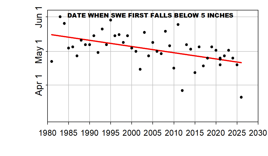 ... or, more quantitatively, guess when the snow water equivalent (SWE) level at the Snotel site on Rock Creek in Eagles Nest Wilderness (Summit County CO) falls below five inches. The graph at the right shows those dates since 1980. The red line (linear regression) shows that the date has been getting earlier by 11 hours per year.
